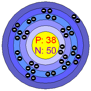 Name: Strontium Symbol: Sr Atomic Number: 38 Atomic Mass: 87.62 amu Melting Point: 769.0 °C (1042.15 K, 1416.2 °F) Boiling Point: 1384.0 °C (1657.15 K, 2523.2 °F) Number of Protons/Electrons: 38 Number of Neutrons: 50 Classification: Alkaline Earth Crystal Structure: Cubic Density @ 293 K: 2.54 g/cm3 Color: yellowish